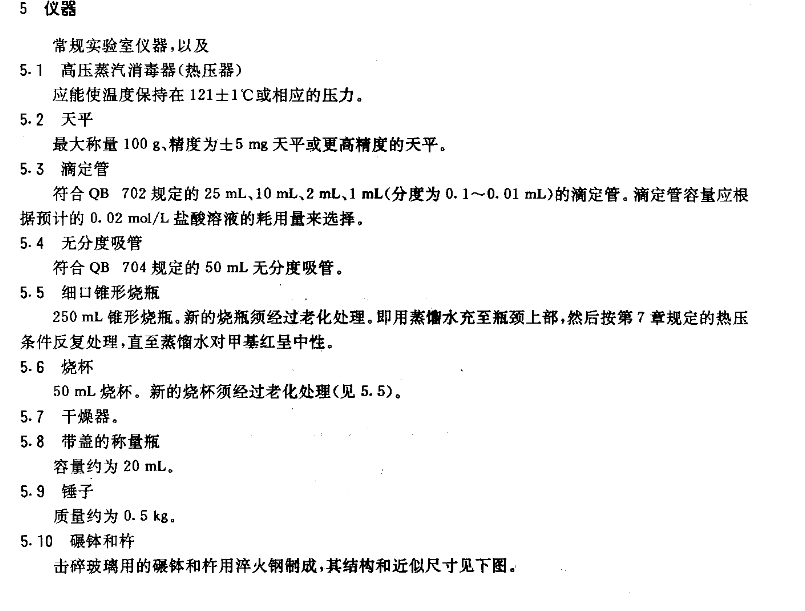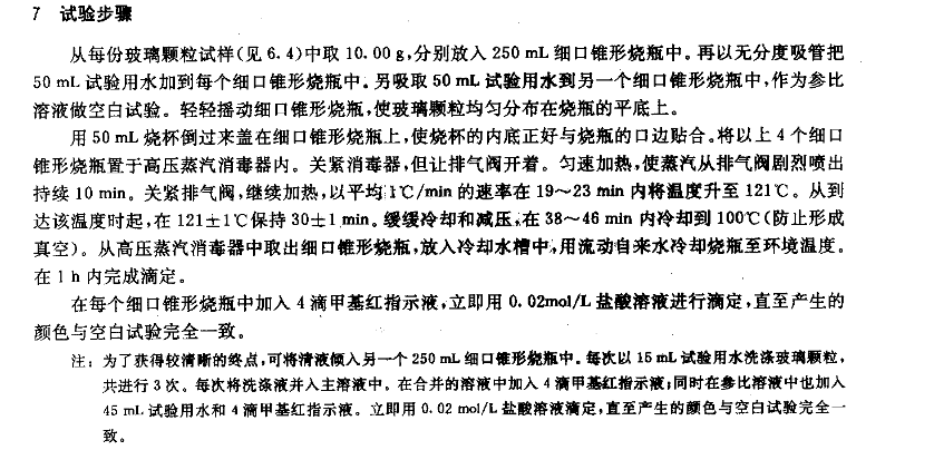 1、用自动振筛机振动套筛(或手工摇动套筛)5分钟,将通过A筛但留在B筛上的玻璃颗粒转移到称量瓶内,玻璃颗粒以多于10g为准。 2、共制备玻璃颗粒3份,用磁铁将每份玻璃颗粒中的铁屑除去,移入250ml锥形瓶中,每次用30ml无水乙醇旋动洗涤玻璃颗粒至少6次,至无水乙醇溶液清澈为止。 3、然后将装有玻璃颗粒的锥形瓶放入烘箱中烘干。从烘箱中取出锥形瓶,置干燥器中冷却。贮存时间不得过24小时。分别取上述样品10.00g,置250ml锥形瓶中,精密加水50ml。 4、另吸取50ml水,作为空白溶液。用烧杯倒置在锥形烧瓶上,将锥形烧瓶放入高压蒸汽灭菌器,打开排气阀,匀速加热,使蒸汽从排气阀喷出持续10分钟,关闭排气阀,继续加热,在19~33分钟内,将温度升至121℃,到达该温度时开始记时。在121℃保持(30±1)分钟后,缓缓冷却和减压,在38~46分钟内将温度降至100℃(防止形成真空)。 5、从消毒器中取出锥形烧瓶,冷却至室温。在1小时内完成滴定。 6、 在每个锥形烧瓶中加入4滴甲基红指示液,用盐酸滴定液(0.02mol/L)进行滴定,直至微红色,并用空白试验校正。 7、碾钵和杵由淬火钢制成,还配有一套不同尺寸的不锈钢筛网(含有A筛:孔径425μm、B筛:孔径300μm、O筛:孔径600μm-1000μm)。