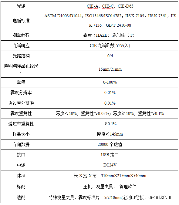 2、满足CIE-A、CIE-C、CIE-D65三种标准照明光源下的雾度与全透过率测量
