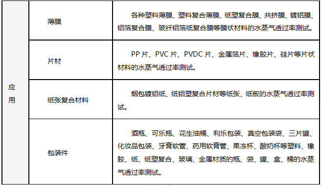 适用于各种塑料薄膜、复合膜、铝箔复合膜、镀铝膜、PVC硬片、药用铝箔、共挤膜、流延膜、太阳能背板等材料水蒸气透过率的测定。通过对水蒸气透过率的测定,达到控制与调节包装材料阻隔水蒸气的技术指标。